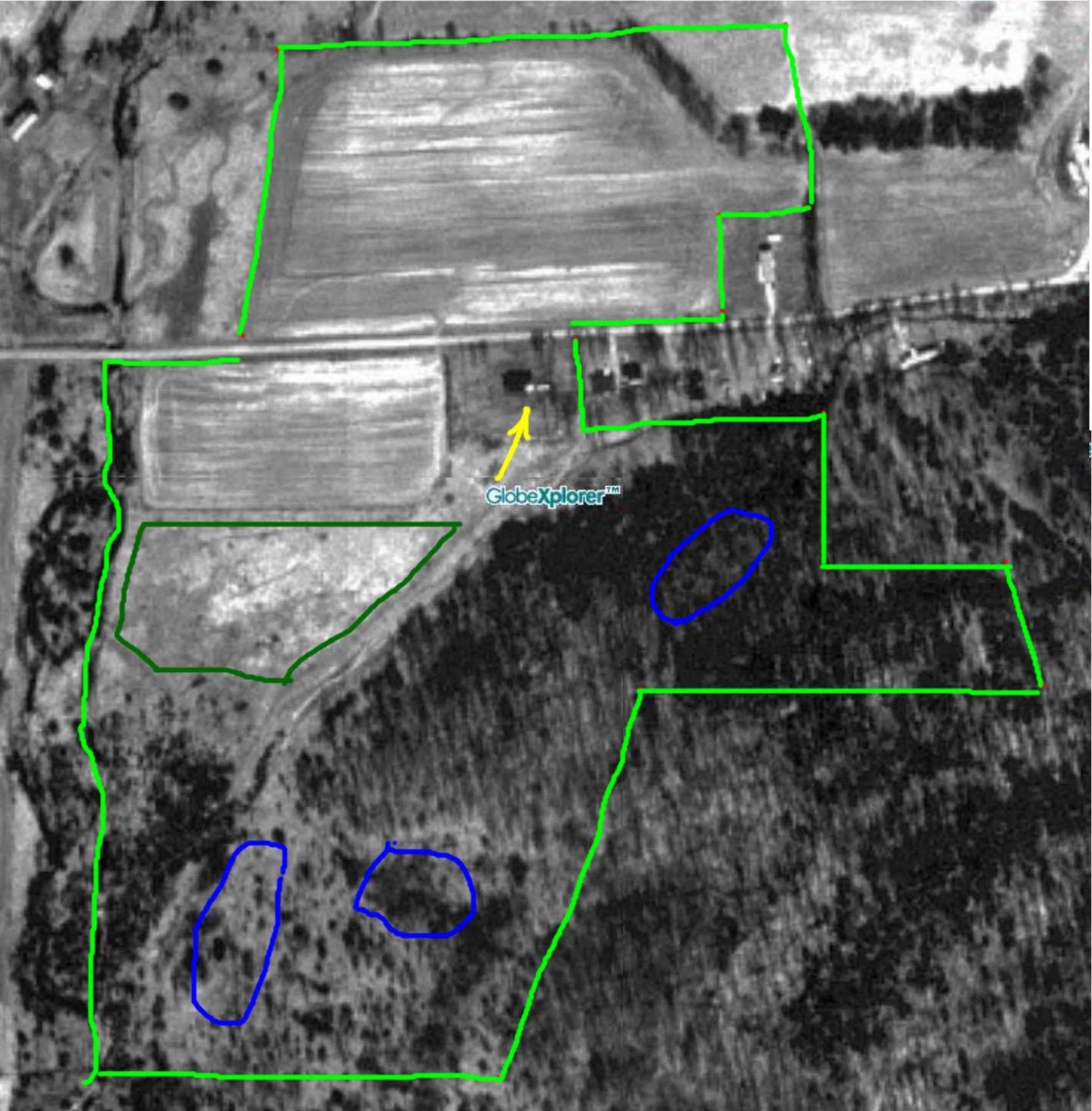 Airial view of our place. Light green line is our approximate property line. Yellow arrow is our house. Dark green is where I have been mowing. Blue lines are possible pond locations.